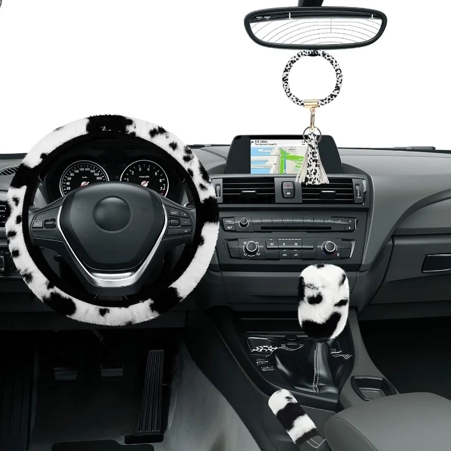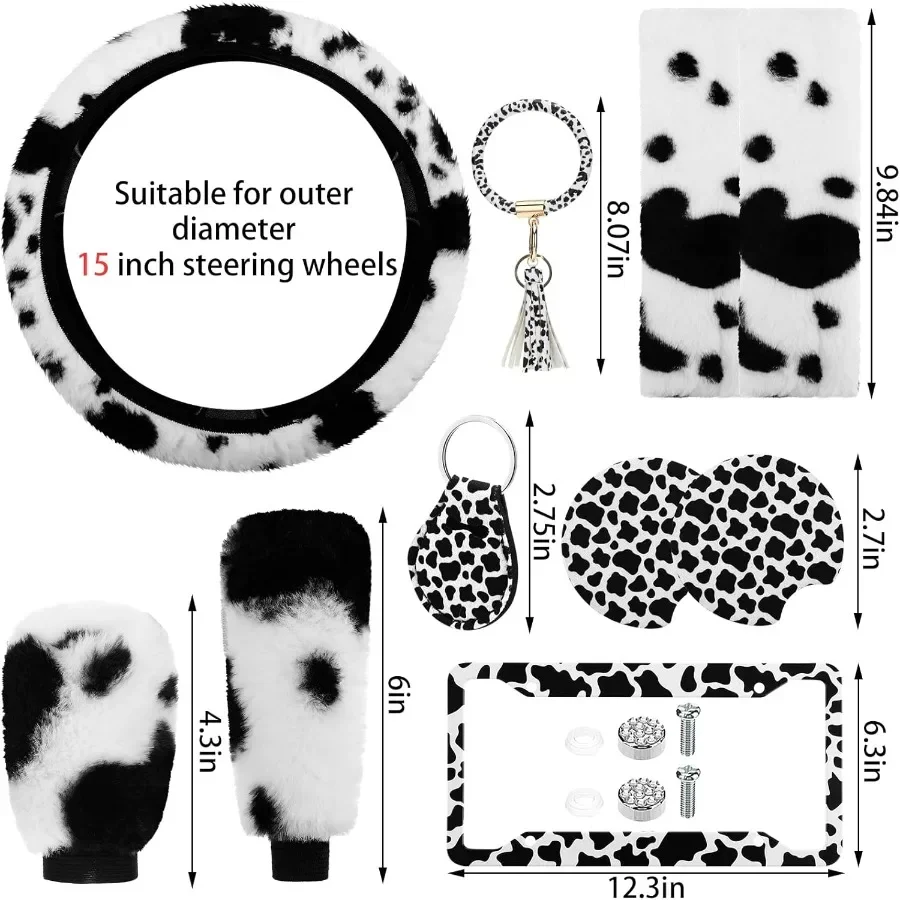 Cow Print Car Set Contains: our cow print car accessories set uses a cute cow pattern, including 2 car cup holders, 1 plush steering wheel cover, 1 shift cover, 1 handbrake cover, 1 bracelet ornament, 2 seat belts, 1 key chain, and 1 license plate holder, elegant and stylish decoration for ladies and car interiors, stylish design and quality, refreshing your car interior