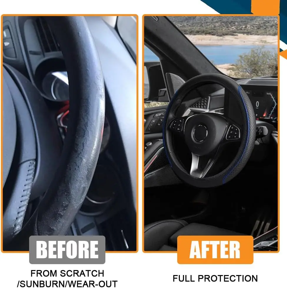 [Protection and decoration] : The steering wheel protector fully covers the steering wheel of the car to protect the original steering wheel from being scratched, aged, worn and faded. The simple and elegant appearance and the luxury leather steering wheel wrap perfectly match your beloved car and add some style to it! This steering wheel accessories is loved by many male and female drivers